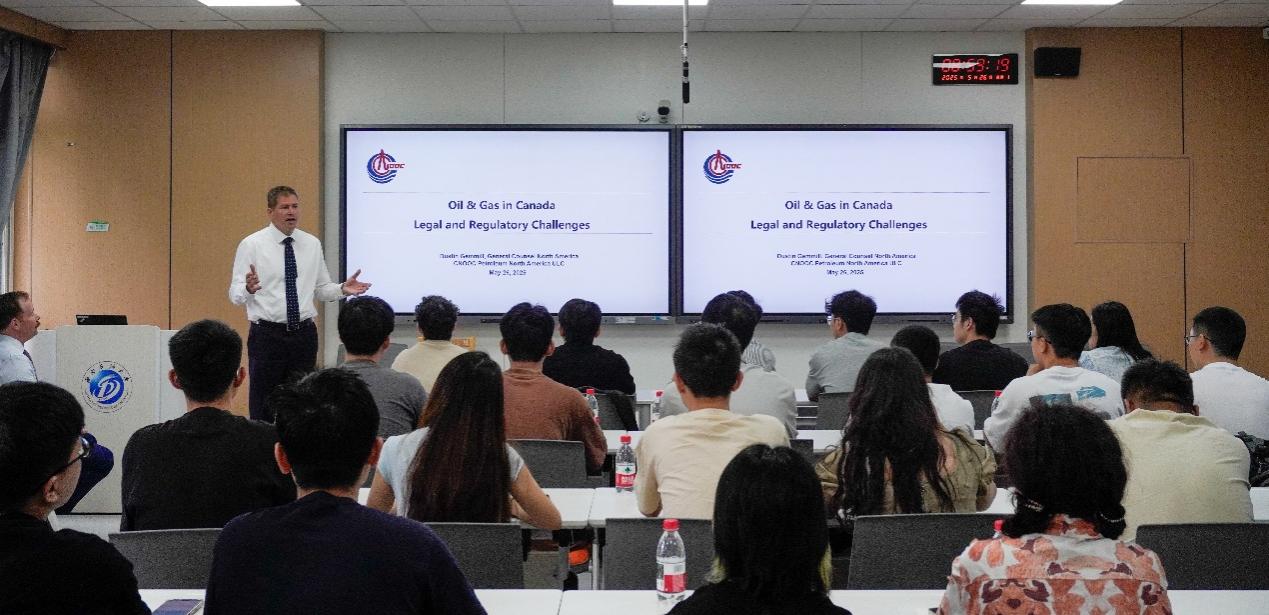 为深化校企合作、加深产教融合,5月26日中国海洋石油国际有限公司(以下简称“海油国际”)资深外籍专家Tim Jenkins(高级工程师)和Dustin Gemmill(法律总顾问)来校授课,为中国海油战略硕士班学生带来主题为“国际化石油公司海外工程建设经验”和“国际化石油公司海外法律基础体系与实务要点”的主题讲座,我校及成都理工大学四十余名学生积极参加。